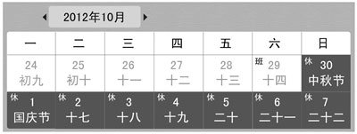 《2012年中秋節(jié)、國慶節(jié)放假安排通知》。9月30日(星期日,中秋節(jié))至10月7日(星期日)放假調休,共8天,而9月29日(星期六)則要上班。