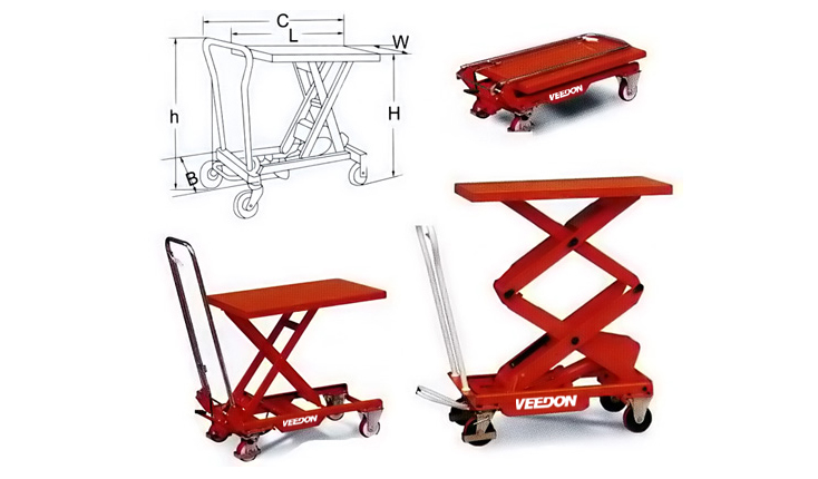 類型 | 載荷 | 臺面尺寸長×寬 | 臺面高度H最大/最小 | 手柄高度H | 滾輪直徑 | 輪廓尺寸B×C | 腳踏開關(guān) | 凈重 |