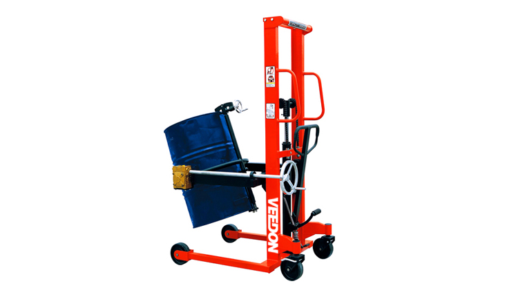 適合鋼制油桶和200L雙層閉口塑料桶的搬運(yùn)、堆高、 90度手搖翻轉(zhuǎn)倒料于一體;